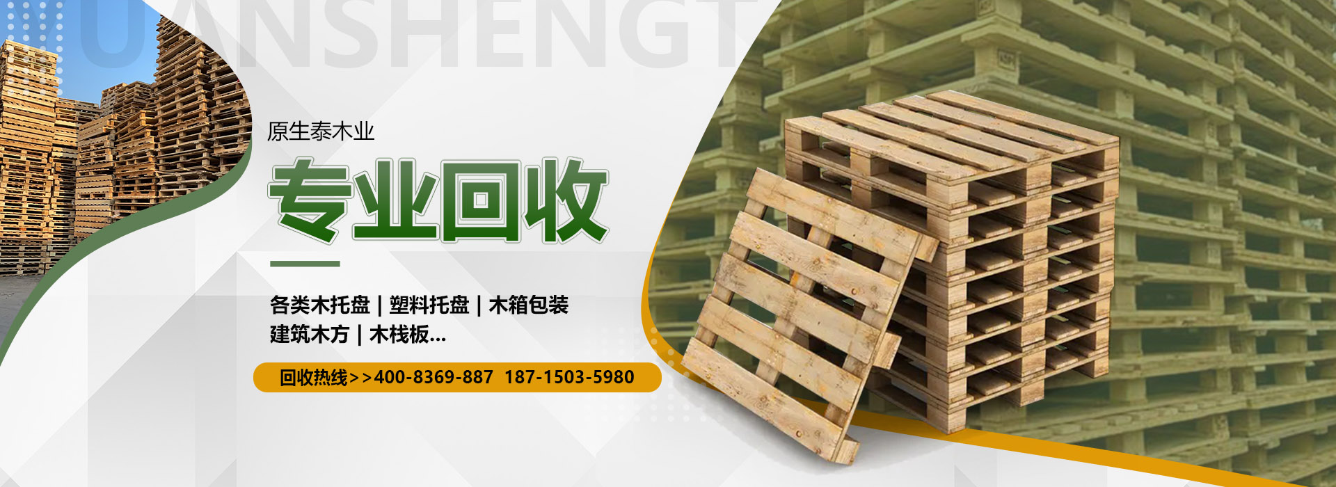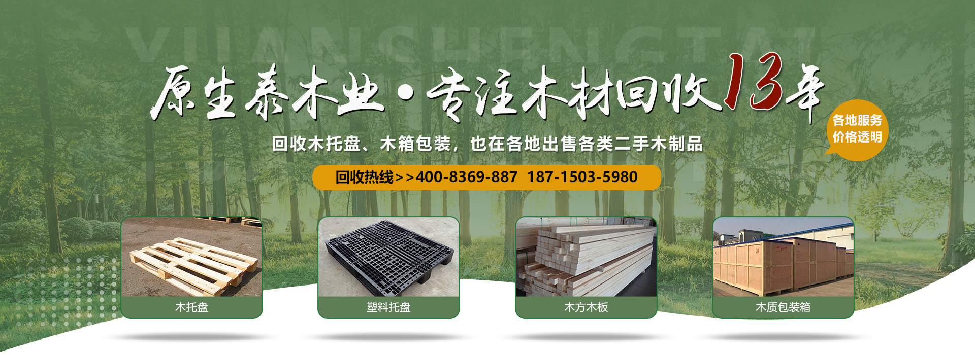 關(guān)于我們原生泰木業(yè)有限公司是一家服務(wù)各市的企業(yè),本公司是以回收各類二手廢舊木材為主,主要回收各類木托盤、塑料托盤、木箱包裝、建筑木方木板、木棧板等等。本公司收購價格以托盤、木箱木材的規(guī)格、使用情形、新舊程度、材質(zhì)為估價標(biāo)準(zhǔn),如果您有意向出售您的閑置木制品以及塑料制品,請您聯(lián)系我們時告知其數(shù)量、尺寸、型式、使用情形,我們免費(fèi)為您提供電話估價或到現(xiàn)場報價。本公司是一家經(jīng)工商局嚴(yán)格注冊的正規(guī)木制品回收公司,回收木托盤、木箱包裝致力于環(huán)保建設(shè)、綠色合作以求雙贏。同時原生泰木業(yè)公司也對各地范圍出售二手木托盤、二手塑料托盤、各種二手木制品。及時送貨上門,價格公道。公司下轄木材加工廠,組裝廠,并備有大型標(biāo)準(zhǔn)烘房,多功能平板刨,壓刨,挖槽,機(jī)械設(shè)備等。產(chǎn)品主要生產(chǎn)各類木托盤、木包裝箱銷往國內(nèi)大中型城市并隨貨通行出口國外。本公司將以豐富的知識,提供合適的方案來服務(wù)和滿足每一用戶不同的需求,品質(zhì)至上,誠實(shí)守信。